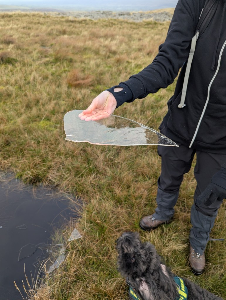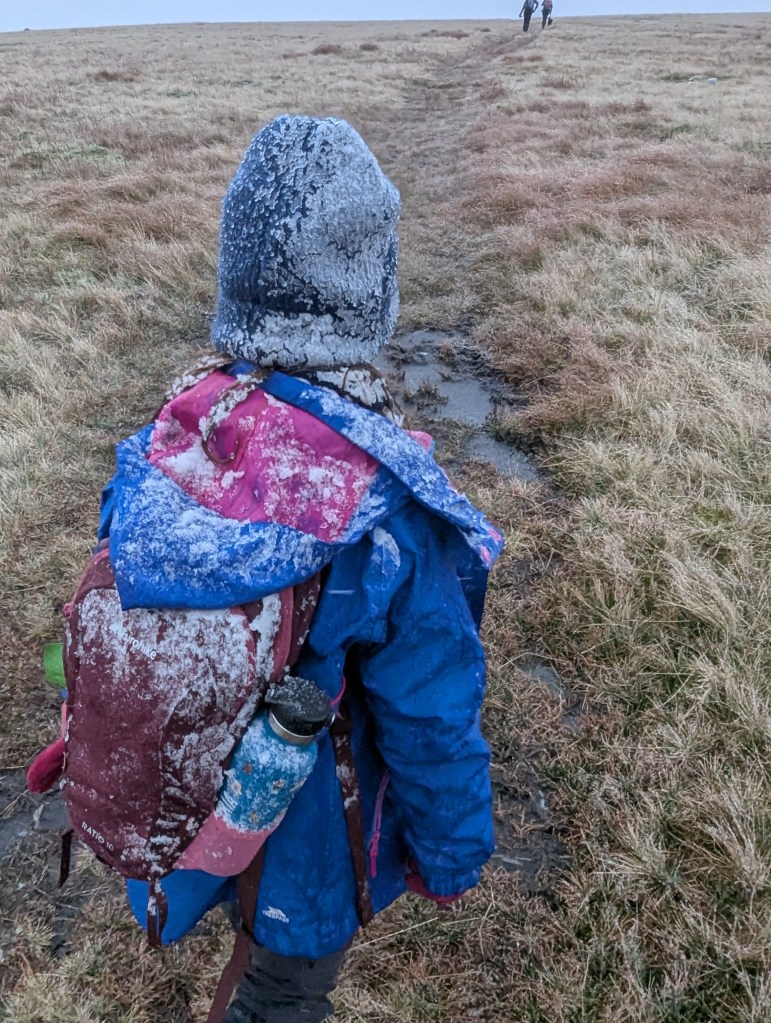Continue up this path to the summit. There are some interesting looking cairns to investigate but it was trying to snow at this point so we decided to head to the trig point for some tea and cake. The girls had been having fun pulling ice out of the puddles as it was all pretty frozen up there. The trig point is off to the west and has a shelter built around it. This was really appreciated because the clouds were swirling around us at times like we were walking in pea soup.