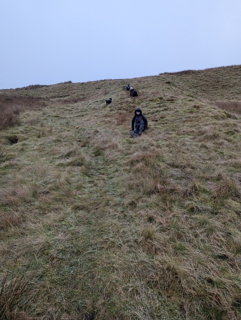 There is a pretty good path linking Wild Boar Fell and Swarth Fell. Swarth Fell is pretty much to the south of of Wild Boar Fell about 2.25km away. It really started to snow at this point and we were making jokes about us being real mountaineers walking in the snow. The kids were having a great time and so was Hagrid, who seems to like the snow a little too much.