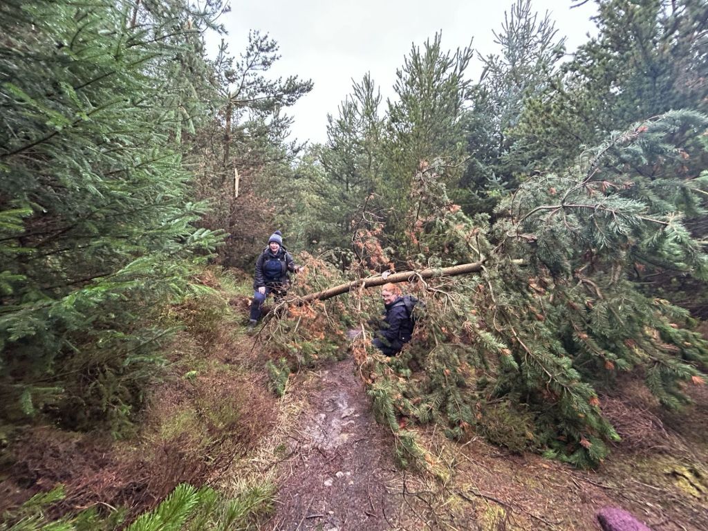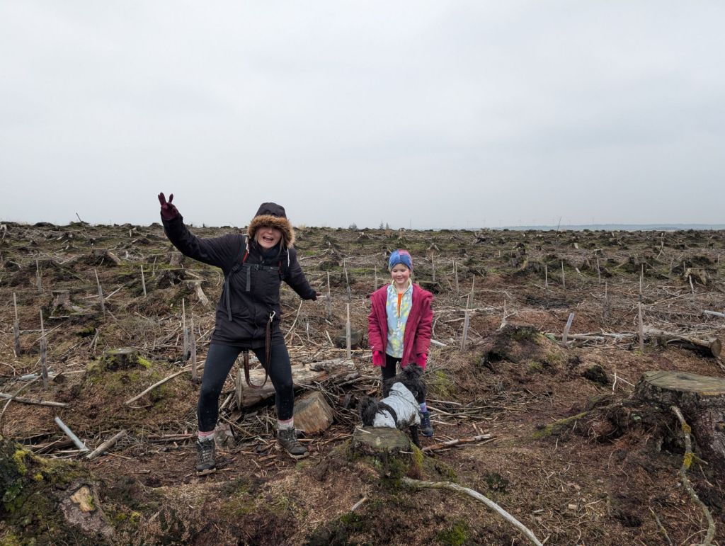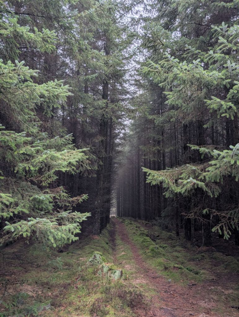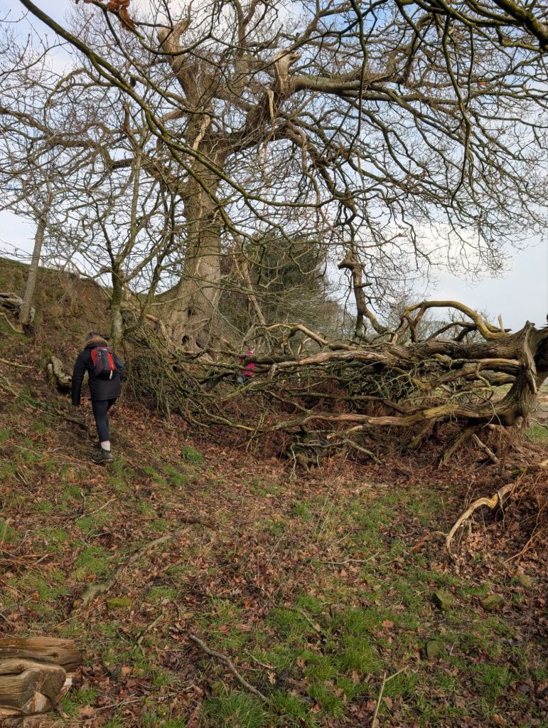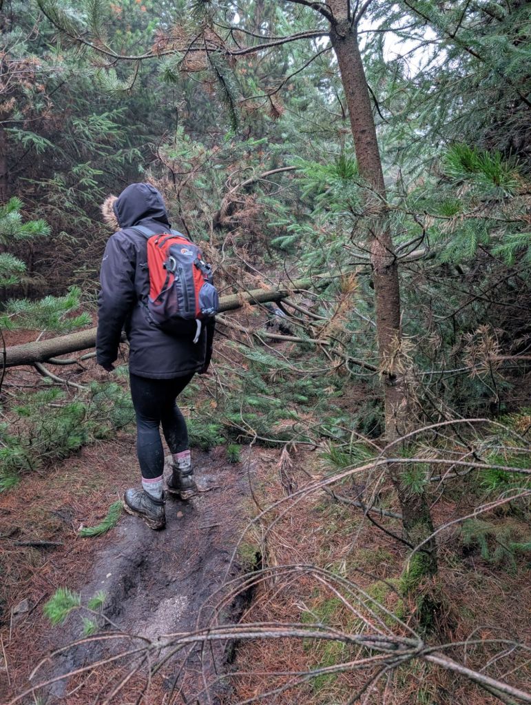 Once through the muddy fields we were due to walk through the woods on the os map. Logging had happened though and our path forward became very difficult. We were supposed to follow the path that runs via the wall, but this became impassable and we walked up a track instead. This is where I had my second muddy fall.