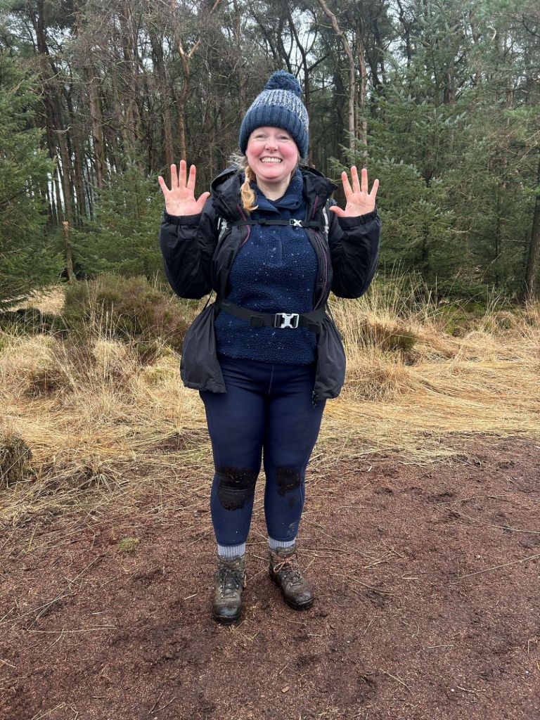 Once we had walked past Scargill reservoir and followed a long road up to Norwood Lane, I noticed a trig point on the map that I needed to visit. Que a slight detour from our route through Stainburn Forest. There had been lots of logging and the path was all churned up, muddy and slippery. My first fall of the day happened here in the mud, much to Rachel’s amusement. Karma was on my side though and Rachel slipped on a wet tree stump and nearly did the splits.