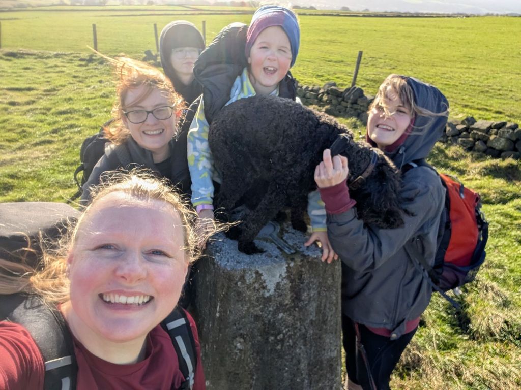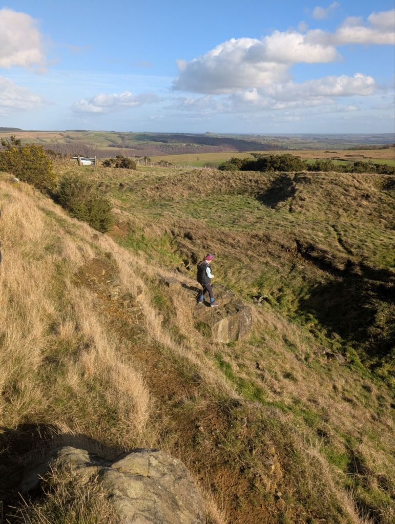 It was a warm day and walking up the hill I ended up taking off a few layers. It felt nice to feel the sun. Once out of the woods we followed a track through some farm land and past the remains of Dob park lodge. We came to a road and followed this to the busy road which leads out of Otley and where we had wanted to park originally. Thankfully we only stayed on this road for a short distance to get a trig point.