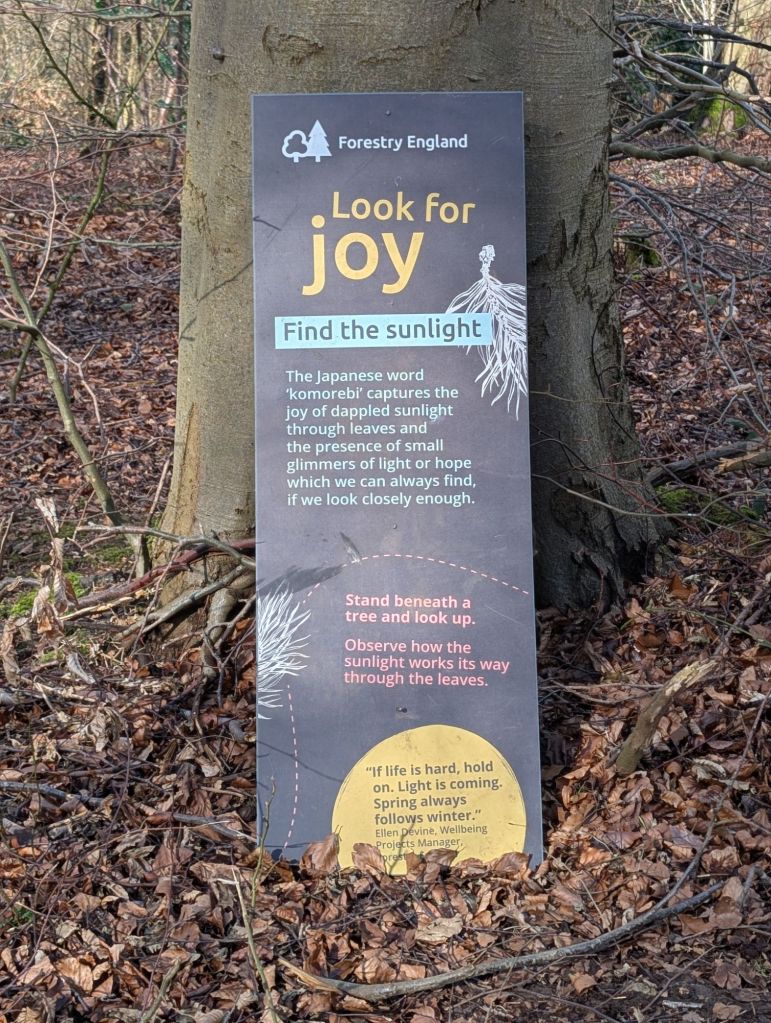The walk started on a wellness trail with signs from Forestry England. Zara found the concept quite amusing. We were walking on a great path through the woods and steadily climbing.