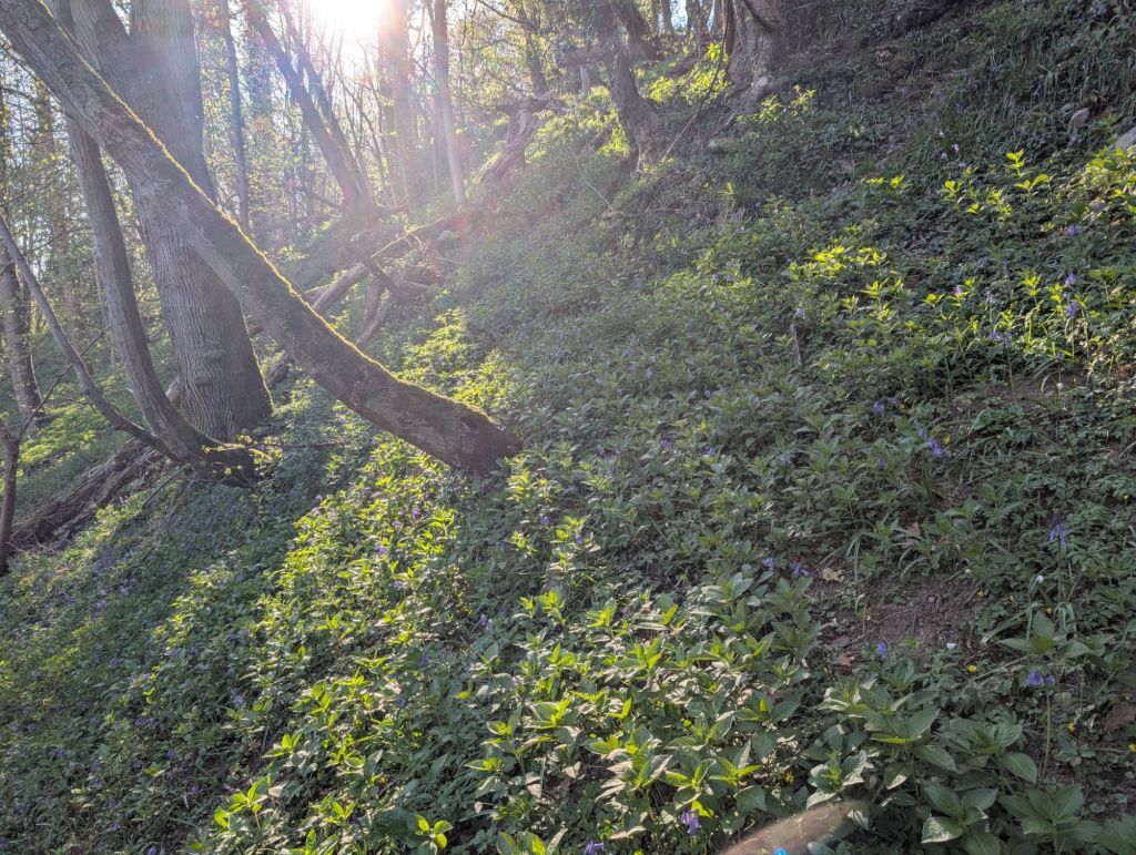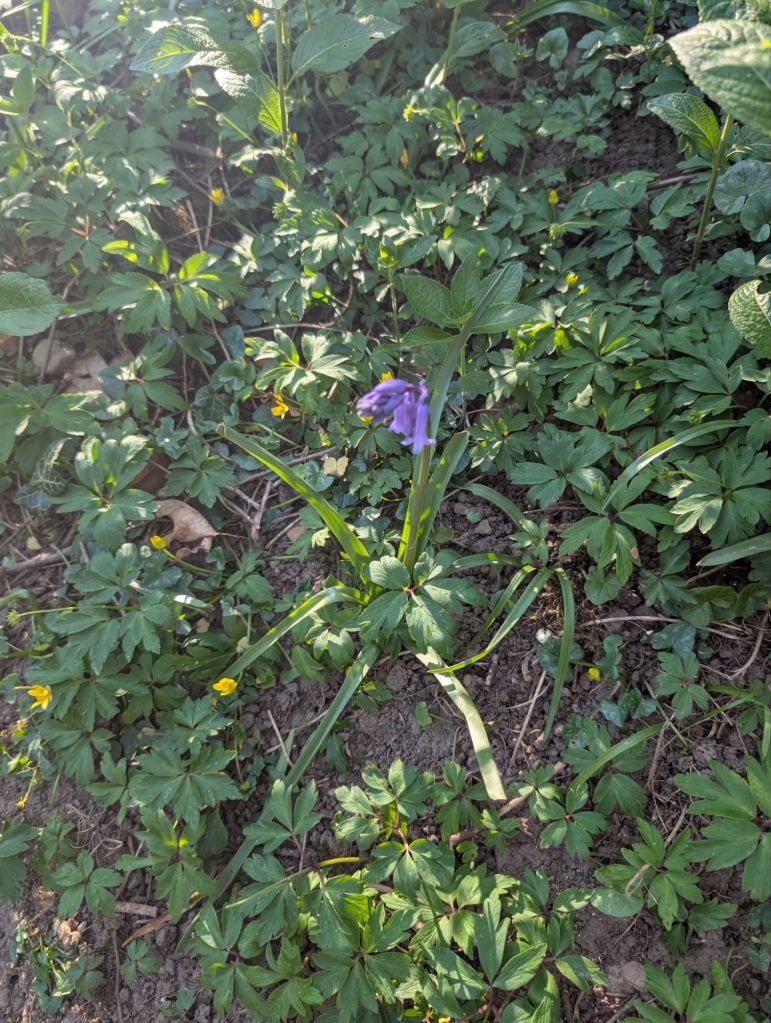It was along this stretch that I could no longer wear my boots. The Compeed can only do so much. Luckily I had been carrying my trail shoes, so footwear changed and my boots were strapped to my rucksack. We then headed up the hill through some woods where the bluebells were out.