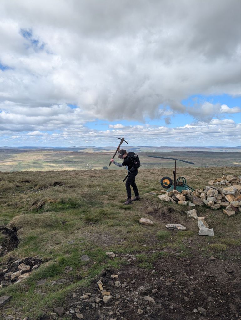 The trig point area looks different to last year and a sheltered seating area has been built. Though some tools have been left up there are Zara couldn’t help but play with the pickaxe.