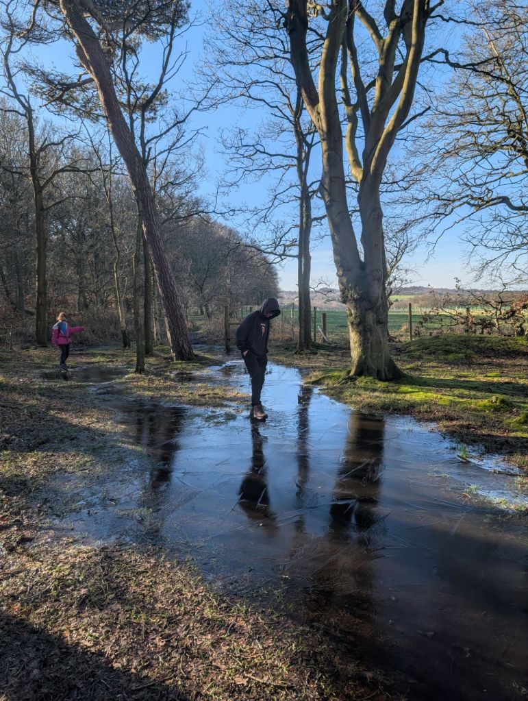 After leaving the park you walk through Eccup Whin. This was very muddy and I was glad that it was icy as it made the going a bit easier. Then came the next side quest. See how many icy puddles could be smashed.